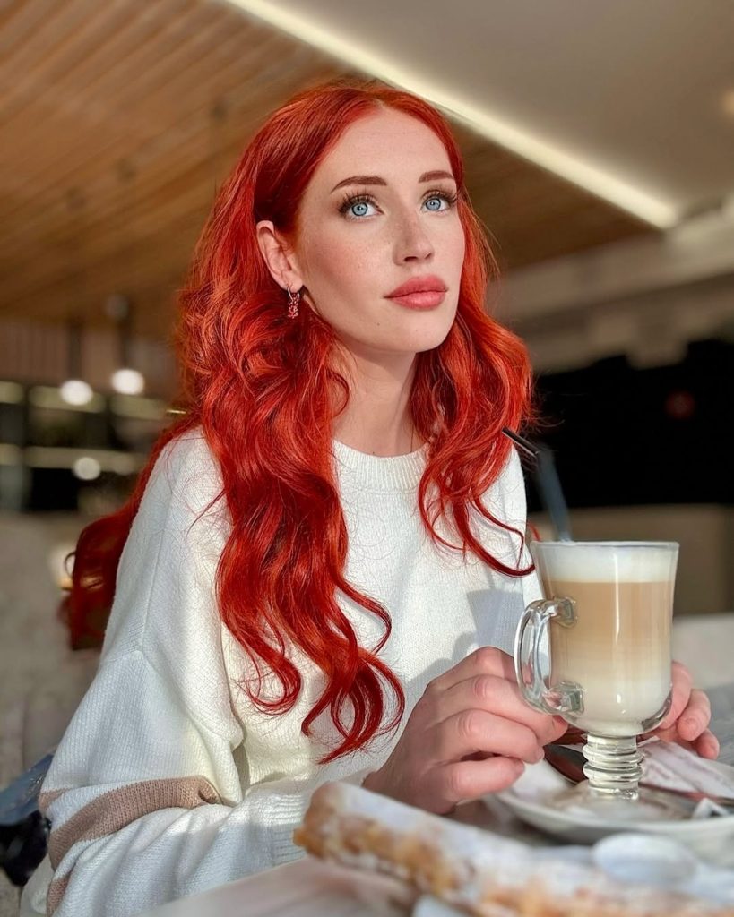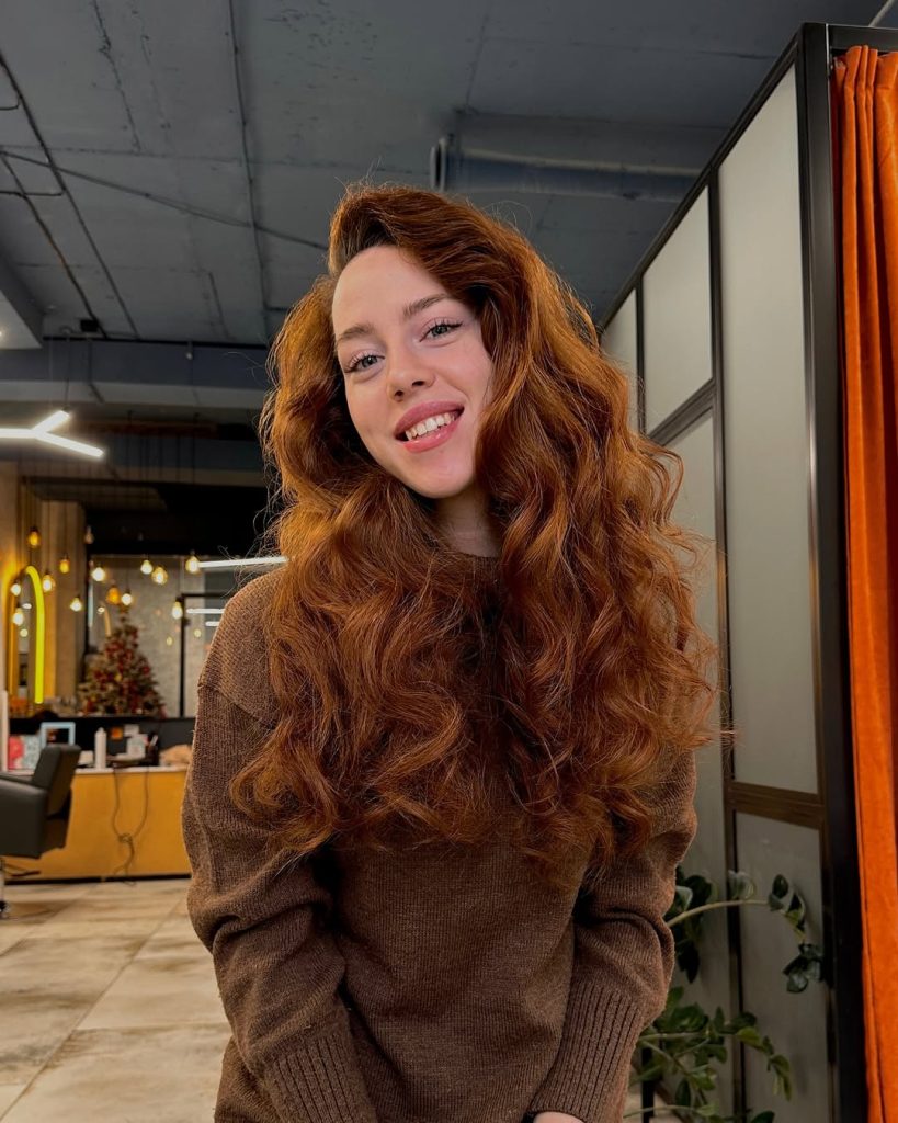 These cinnamon-brownish waves feel soft, feminine, and timeless. The shade has just enough warmth to catch the light, while the flowing curls add a romantic feel. It’s the kind of red hair color in 2026 that never goes out of style, offering a perfect mix of subtlety and charm.