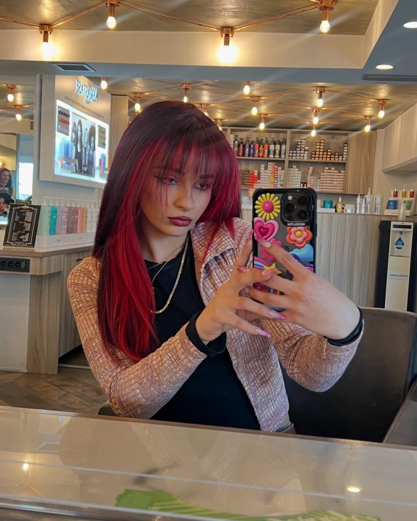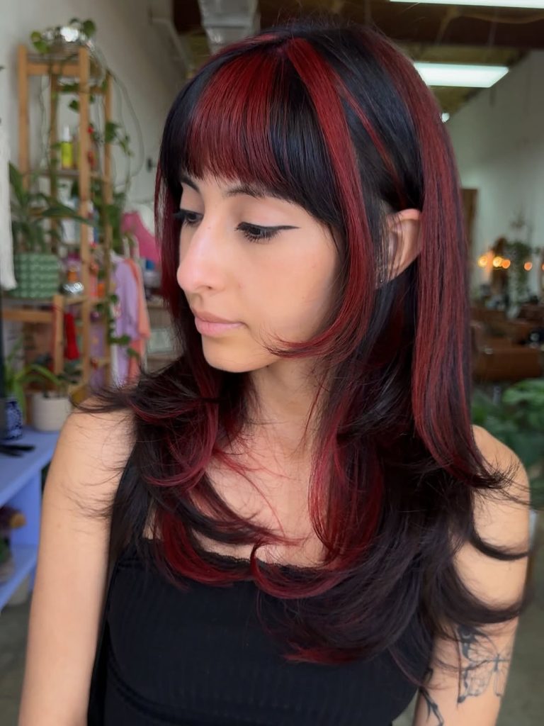 Featuring layers of dark hair with bright red streaks, it’s a fun way for redheads to rock hair color in 2026 without sticking to only one color choice. The style is dynamic because it showcases different colored layers with each different movement of the hair.