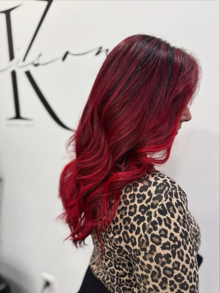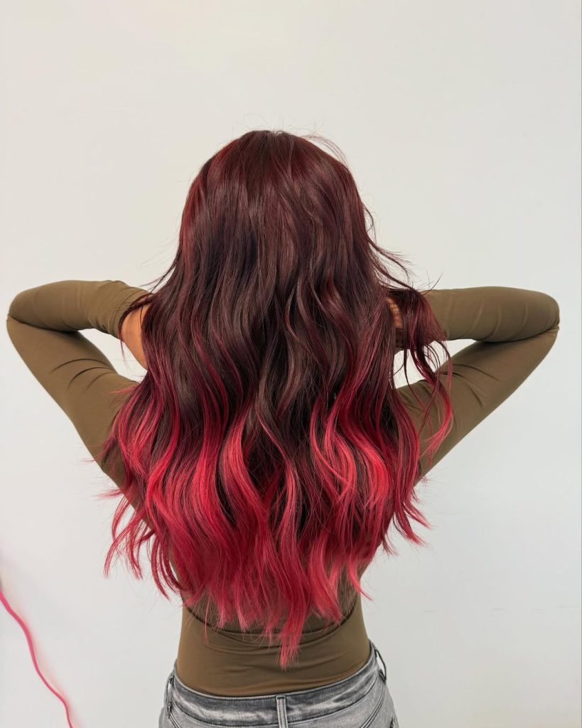 This high-contrast style pairs jet-black roots with bright, almost neon red for a fearless effect. The waves soften the drama just enough, but the red hair color 2026 vibe here is undeniably edgy and modern. It’s a look that turns heads the moment you walk into a room.