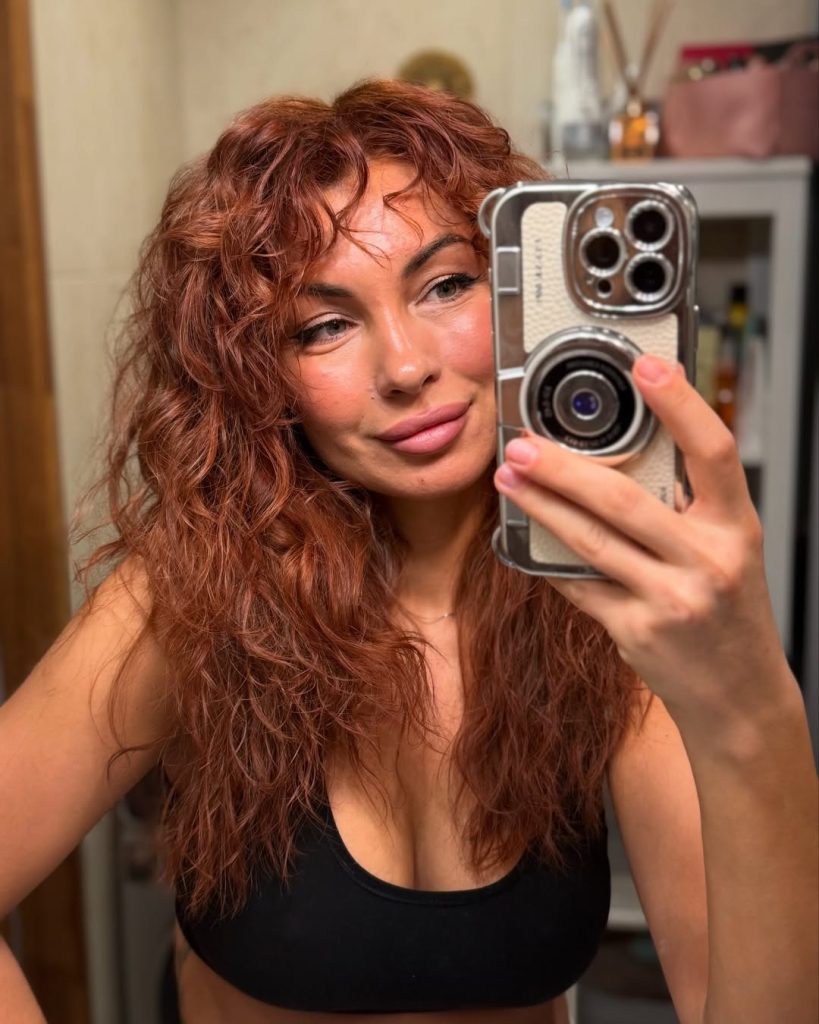 This cut is best for medium to long hair, especially if you like styles that don’t need constant upkeep. A texturizing spray enhances the waves, while the auburn shade looks especially flattering in natural light. It’s a look that feels refreshing compared to darker tones like plum or mahogany.