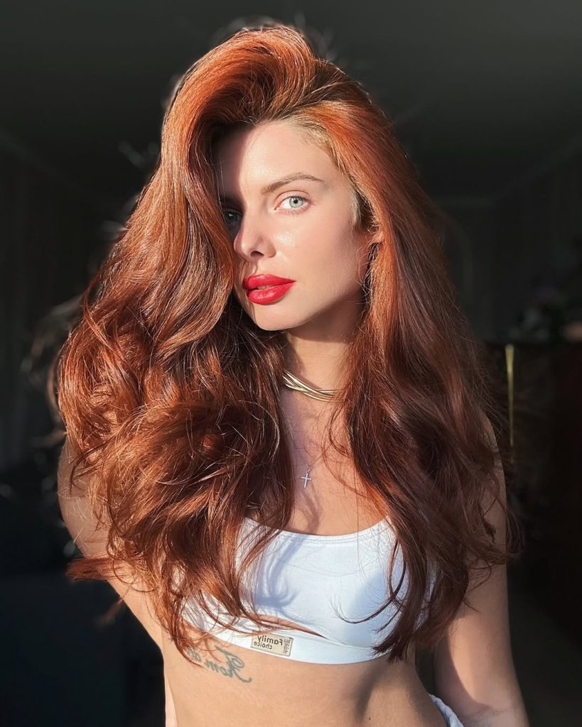 The rich depth of dark copper paired with voluminous waves instantly gives off a glamorous, almost cinematic vibe. This red hair color 2026 version is dramatic yet wearable, balancing warmth with intensity. The way the shade catches the sun highlights its multidimensional tones, from fiery glimmers to chocolate undertones.