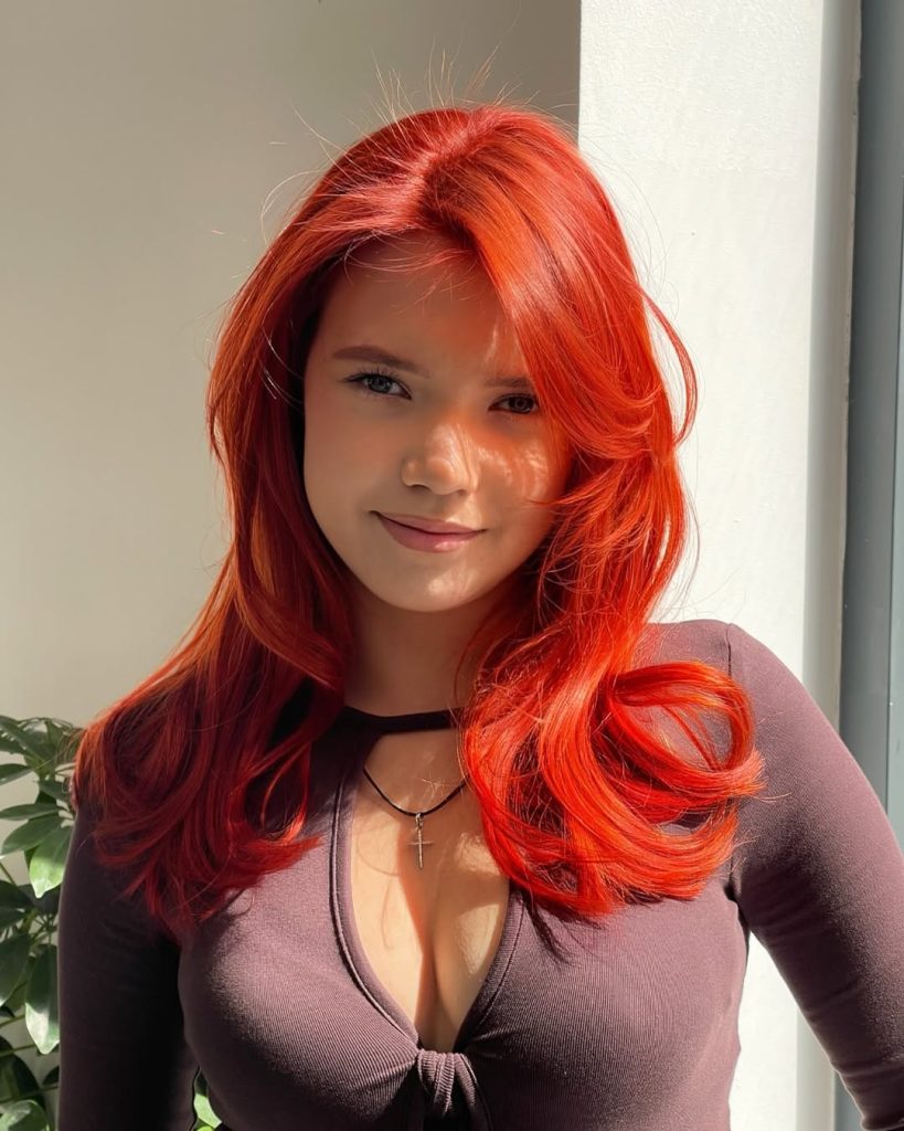 If you’ve ever wanted a hair color that feels as bold as it looks, this fiery coke red is the ultimate statement. It’s unapologetically bright, almost glowing under the sunlight, and it brings a playful energy to any style. The layered cut gives it movement, keeping the look lively rather than overwhelming. This is red hair color 2026 at its most daring and fun.