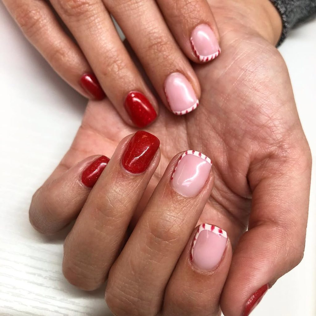 There’s something so nostalgic about candy cane details around Christmas, and this short Christmas nail puts that feeling right into your fingertips. The glossy red polish is paired up with soft pink nails just outlined with playful striped French tips in this cute-yet-festive mix. It’s a simplistic but cute way into the holiday spirit, reminiscent of unwrapping peppermint treats by the fire.