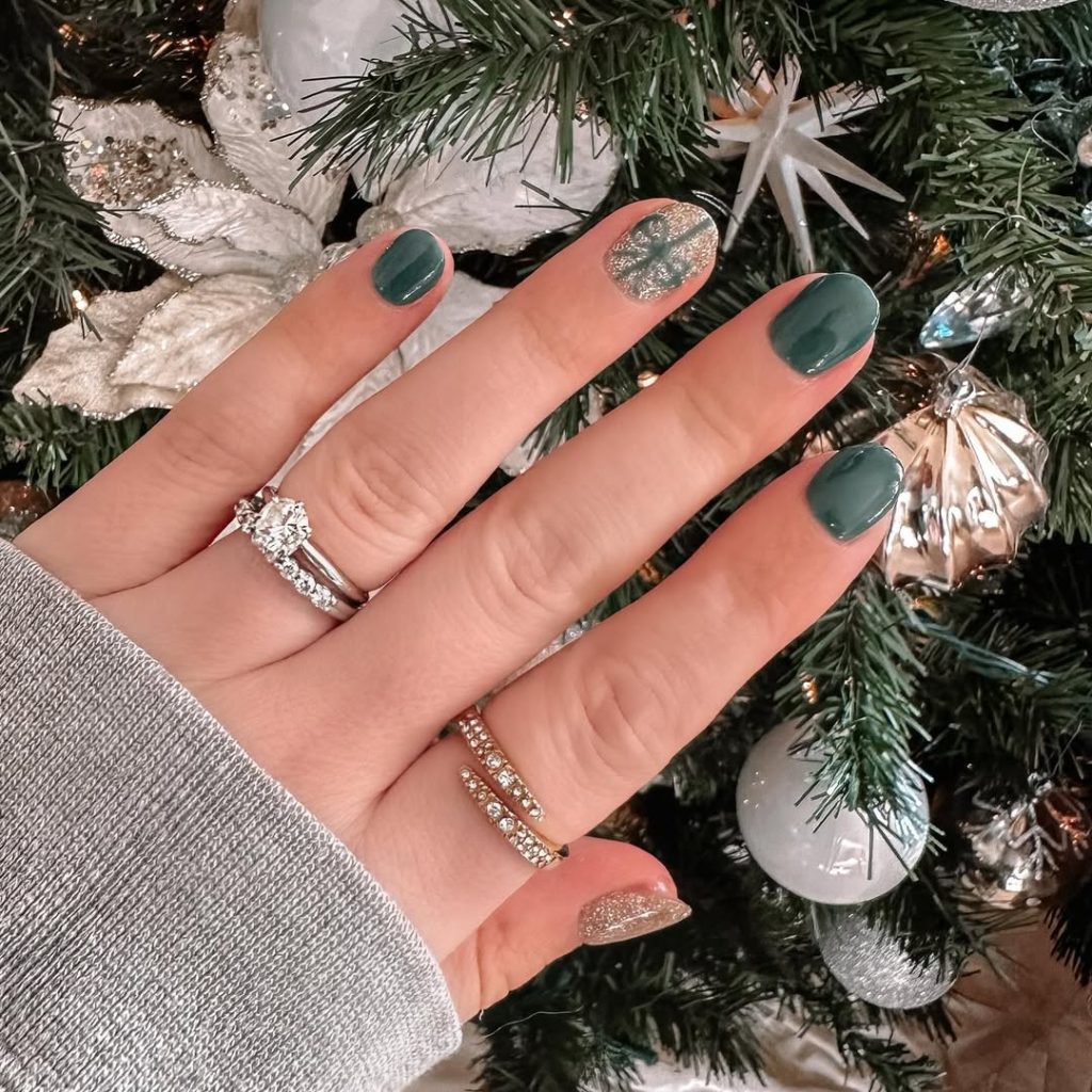 This look captures the happiness of unwrapping presents, with a glittering silver accent nail tied up in a dainty green bow. The other nails glisten in a deep shade of evergreen, with an elegant touch to the otherwise playful theme. It is the type of manicure that feels elegant yet a little bit cute, ideal for a pose at the Christmas tree.