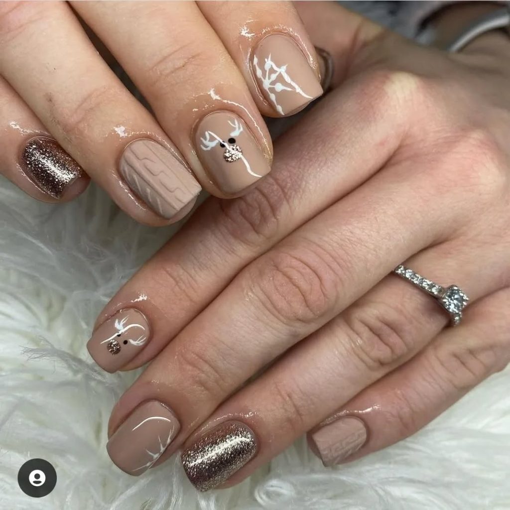 This manicure combines soft, beige tones with playful Christmas art for a chic seasonal look. With reindeer accents, subtle white branch patterns, and cozy sweater textures paired with shimmering bronze glitter, it coaxes in a warm, festive ambiance worthy of casual occasions without too much loudness. It feels elegant and possesses the mystique of holiday inspiration.