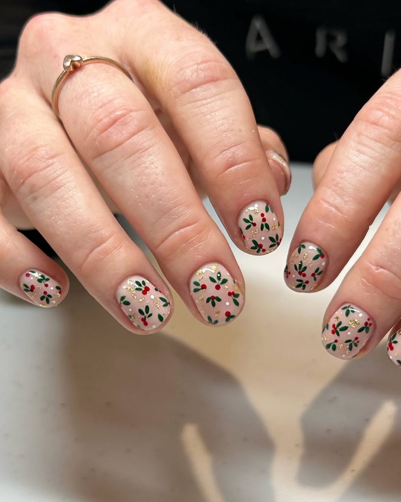 Happy yet full of the charm of a holiday, these nails look like a confetti celebration in your fingertips. Golden accents with green leaves and red berries scattered on nude makes the design playful and adorable. It is an instant reminder of some wrapping paper patterns or Christmas tables décor stuffed with joy and celebration.