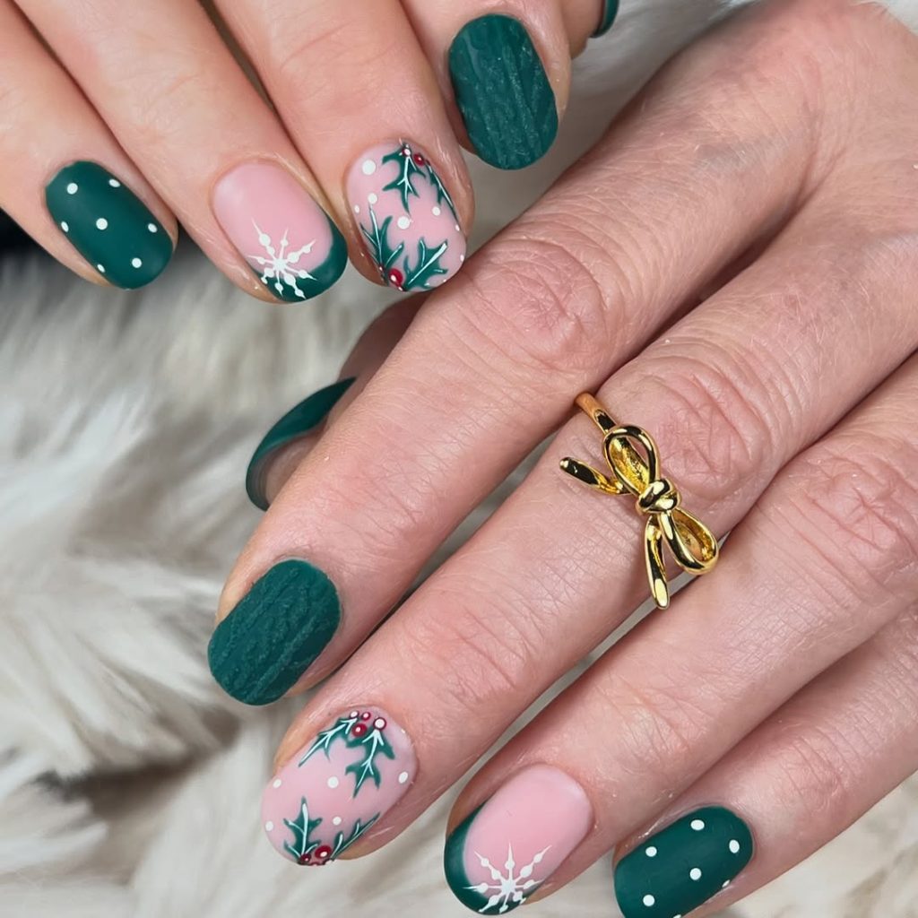 Bold and festive, deep matte green is paired with charming holly accents atop nude nail beds. Add some snowflake details and playful dots to further enhance the seasonal character of the design. It feels rich and wintry-like a holiday wreath on a snowy backdrop, providing the perfect festivity for the season.
