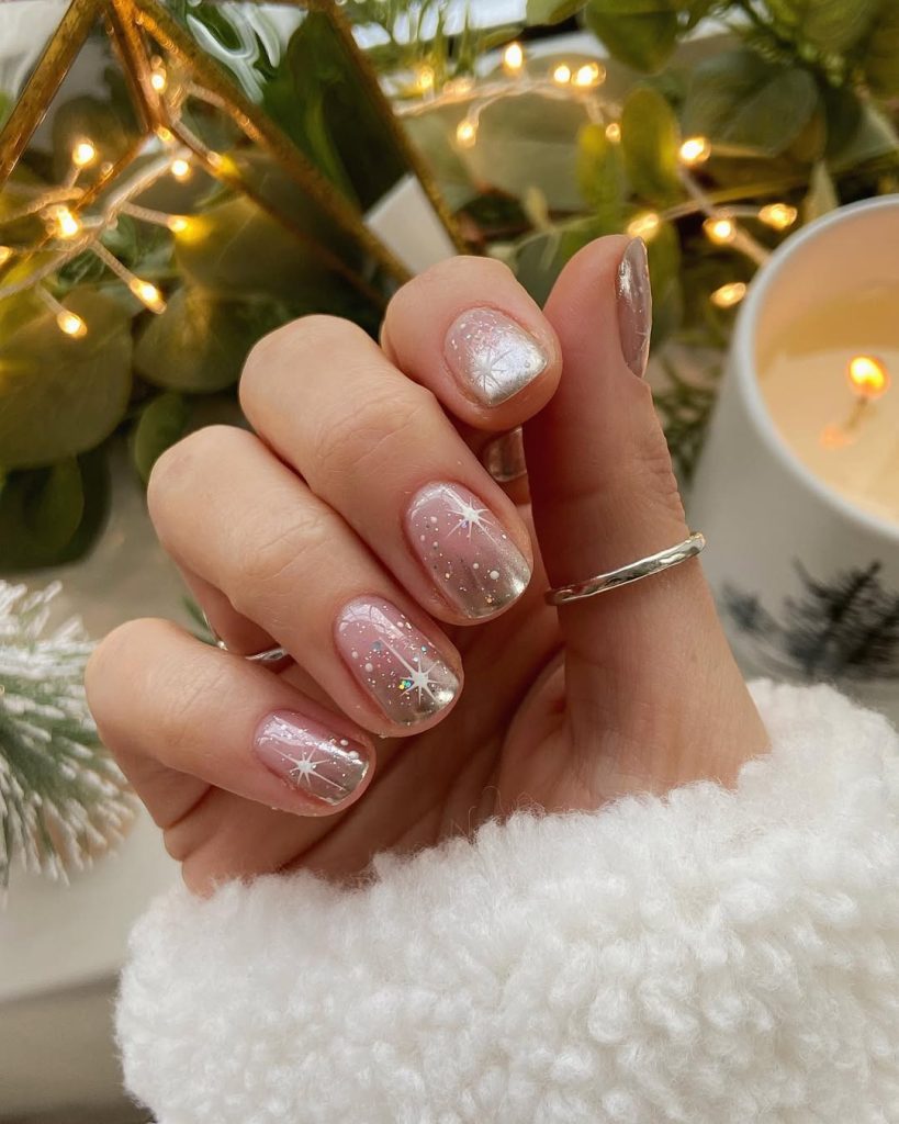 Dreamy and delicate, these nails feel like a starry winter night captured on your fingertips. The sheer pink base with silver shimmer is topped with glowing white stars, creating a magical, frosted effect. It’s a design that sparkles softly under the light, giving your nails a romantic holiday glow.