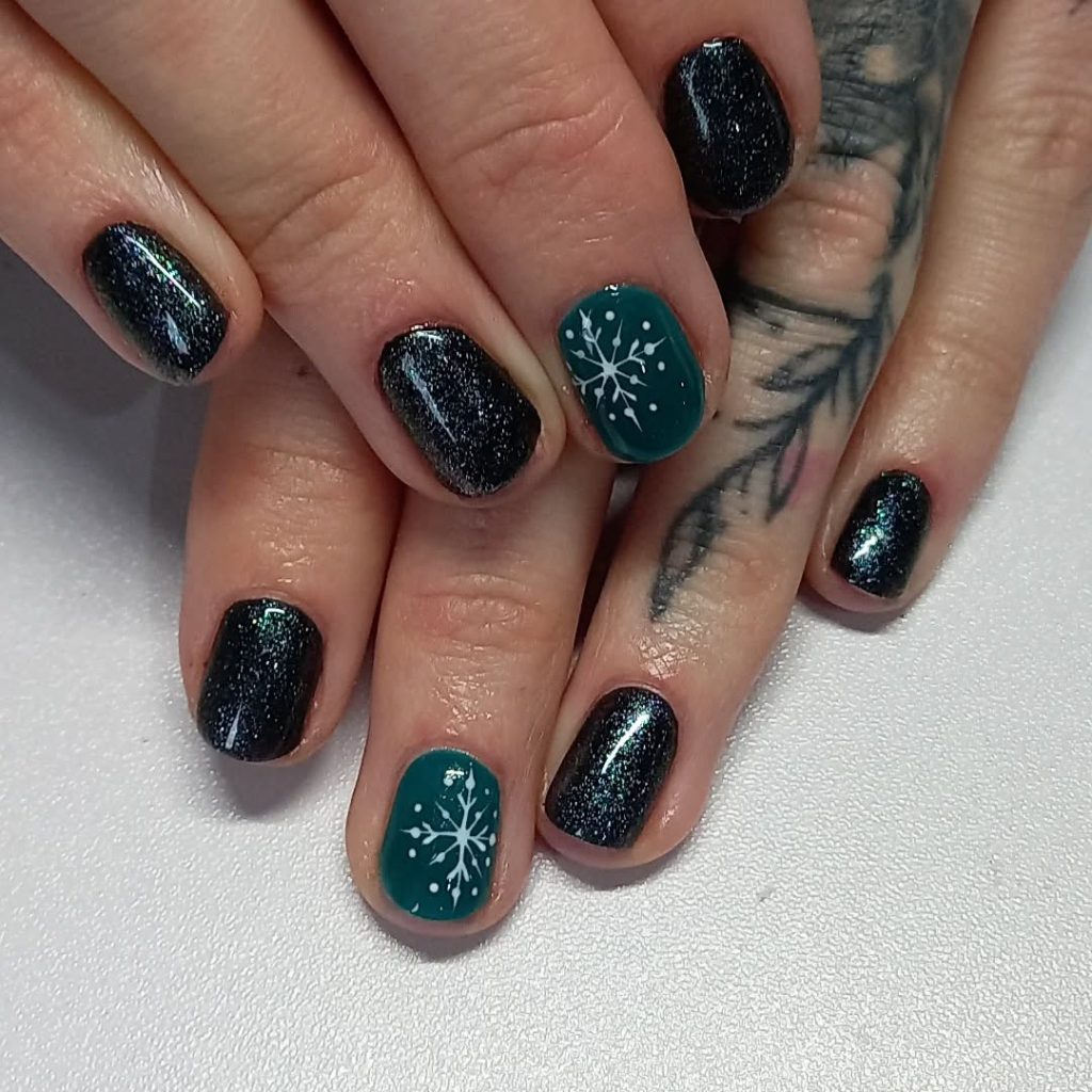 These are dark and moody, a bit magical with their shimmering black polish touched by an uplift of teal with faded white snowflake accents. It has a feeling of being gazed upon while the winter night sky is dotted with drifting snow and stars. A bit dramatic and elegant, the choice speaks of the holiday season in a sleek way.