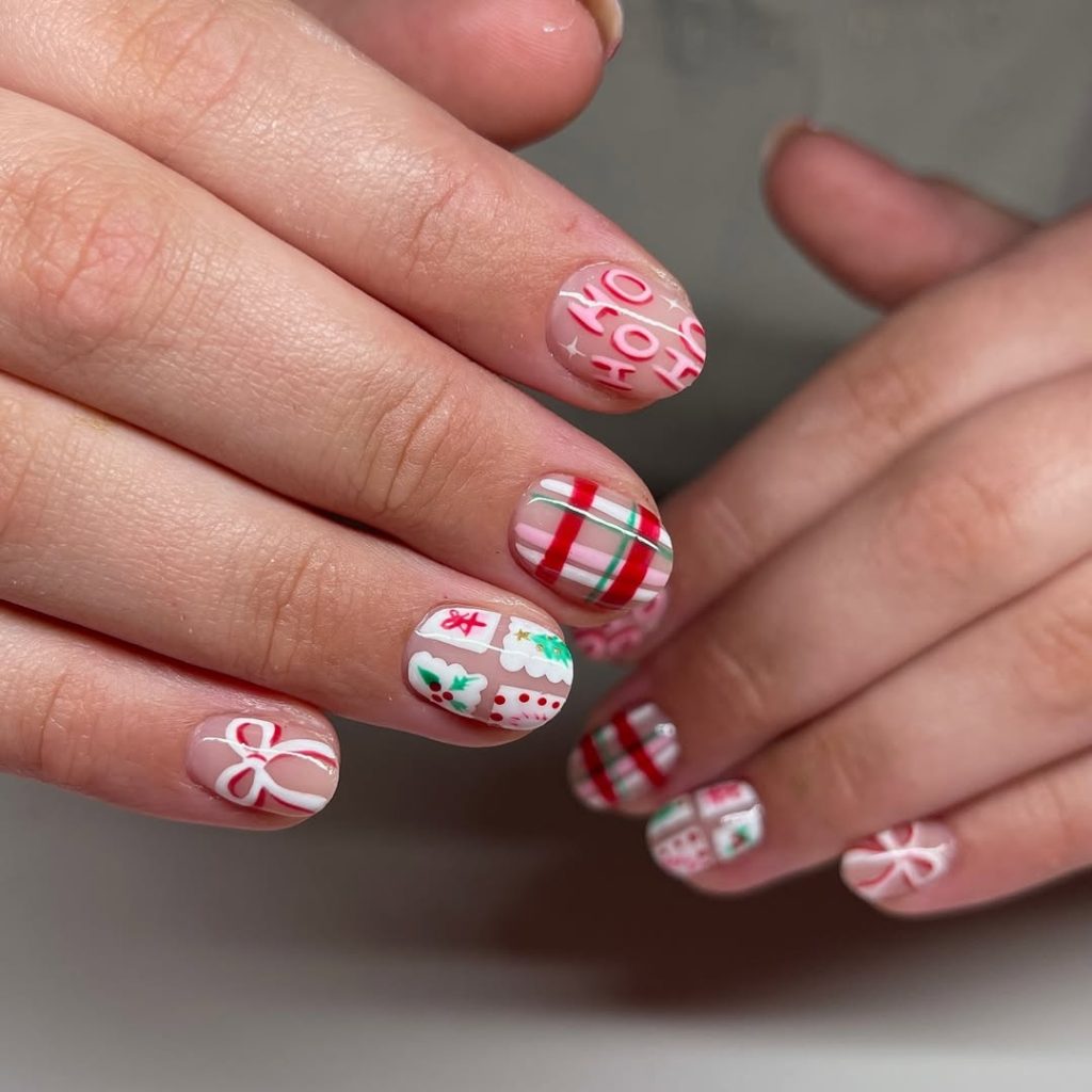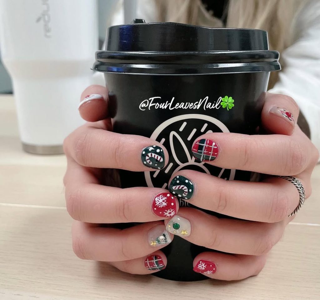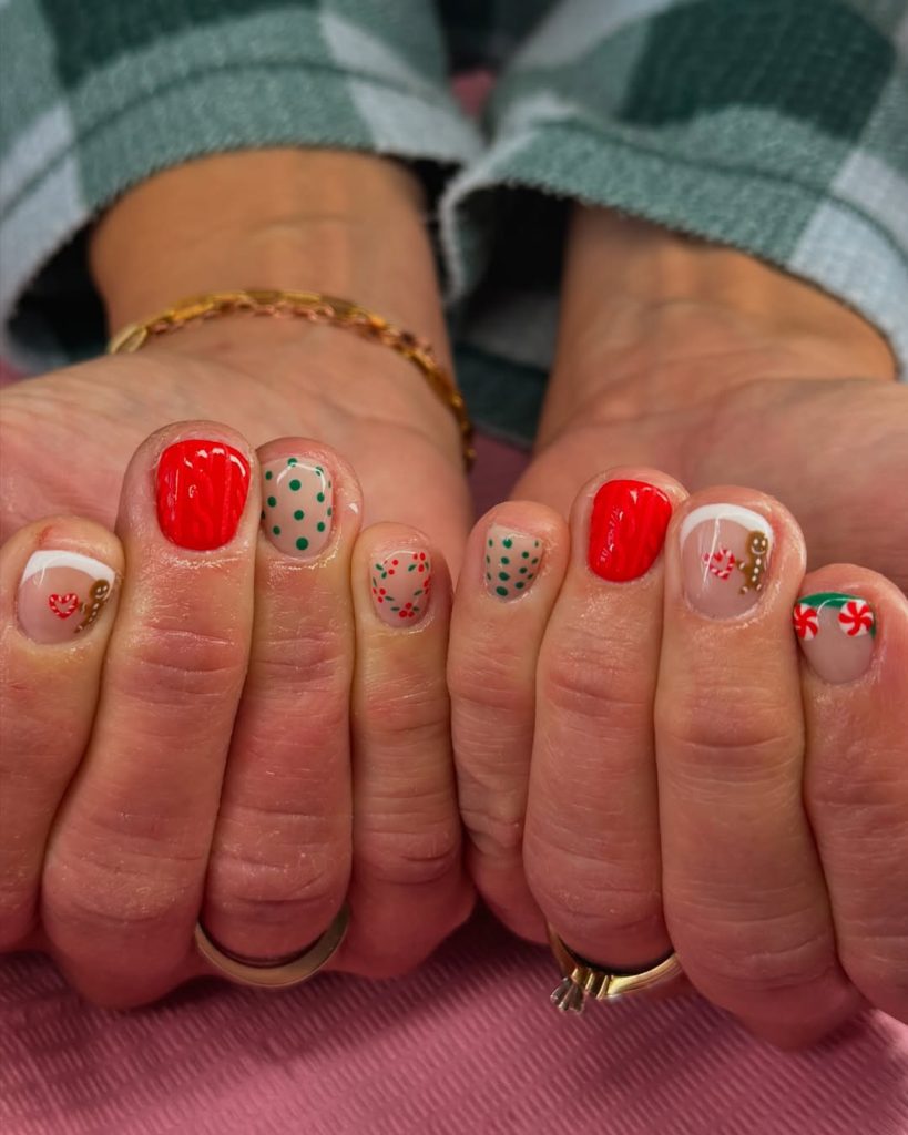 Bright, bold, and full of cheer, this manicure uses red, green, and nude bases with a variety of Christmas-themed art. From polka dots to candy cane swirls and tiny gingerbread accents, it’s a playful mix that feels like holiday fun in every detail. Each nail has its own personality, making the whole set feel lively and creative.