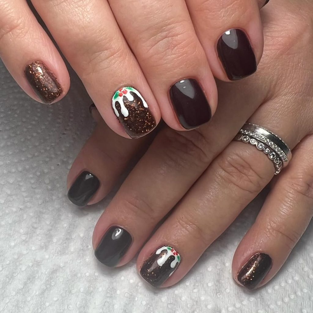 This set is an excellent option for women who want to tease the holidays a little. The square shape helps in managing the design, leaving a nice contrast between glitter and glossy finish to play with texture. For short Christmas nails in 2025 that are uniquely festive, a pudding-inspired set is an absolute must.