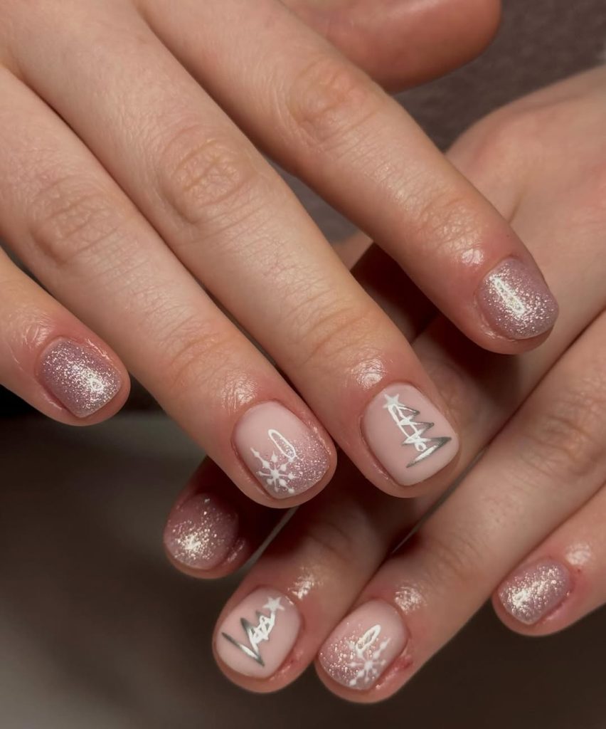 Soft pink bases with a glitter fade meet delicate holiday art—snowflakes, stars, and tree silhouettes. This manicure feels dreamy and delicate, like a frosted windowpane lit up with twinkling lights. It’s subtle but still perfectly seasonal, the kind of design that works for both casual days and Christmas parties.