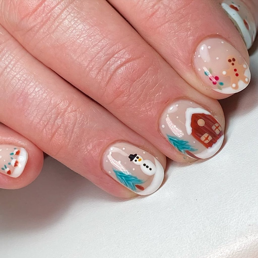 This cute manicure feels like stepping into a charming little holiday village. From gingerbread men to snowmen to cabins covered in snow, every nail tells a little Christmas story. The neutral base really makes the colorful details pop so wonderfully, creating a lively-yet-charming effect. It’s like carrying a winter wonderland on your finger tips.