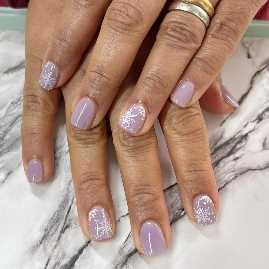 Soft lavender polish is made instantly wintry by delicate white snowflake accents. This design is elegant yet festive, offering a fresh take on holiday nails without leaning too heavily into traditional colors. It’s calming, graceful, and perfect for someone who wants understated beauty during the holidays.