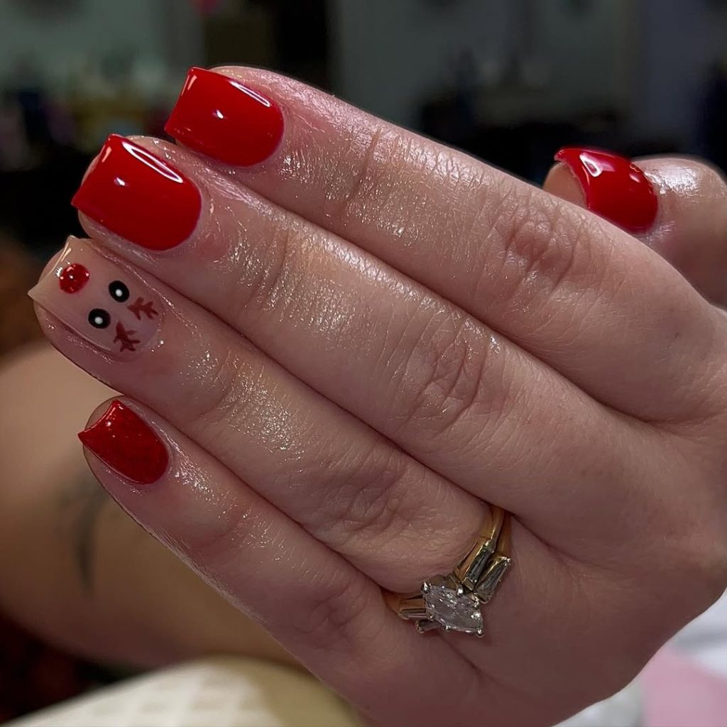This set is perfect for any person who loves bright colors but with a little balance of art. The square acrylic style adds to the durability of the wear, while the simple accent keeps it easy to wear. Short Christmas nails ideas 2025 that are ever so simple and cute will never lose with Rudolph.