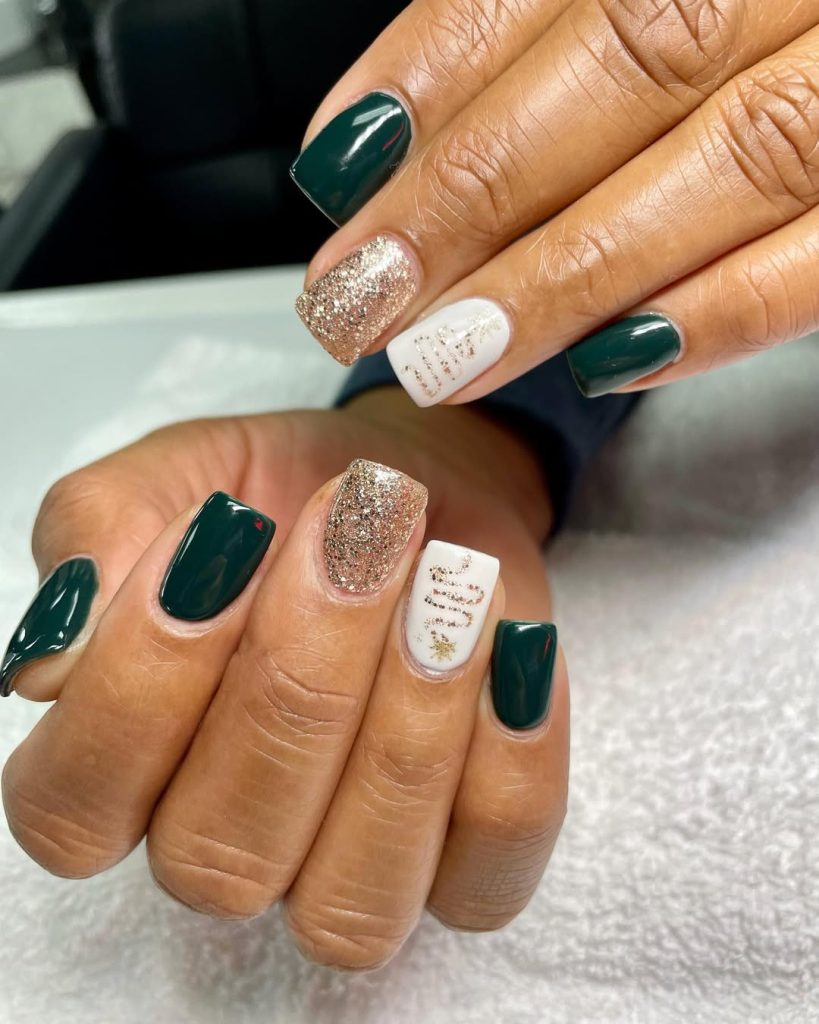 With rich emerald green, gold glitter and minimalist Christmas tree accents combine for a manicure that spells holiday glam. It almost feels luxurious and bold-ish, the right pick for anybody who likes a little drama in their seasonal style. Festive, trendy, and guaranteed to grab light at every holiday bash.