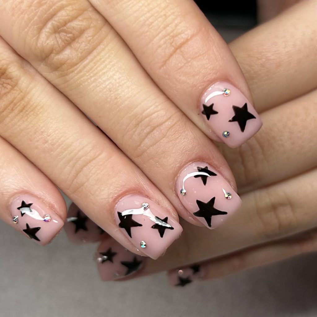 These nails are playful yet edgy, combining a soft nude base with bold black stars and sparkling rhinestones. This contrast allows the design to pop, with an extra layer of sparkle provided by the glossy finish. It is a bit fun and different from traditional holiday nail styles in that its boldness and shine make it festive after all!