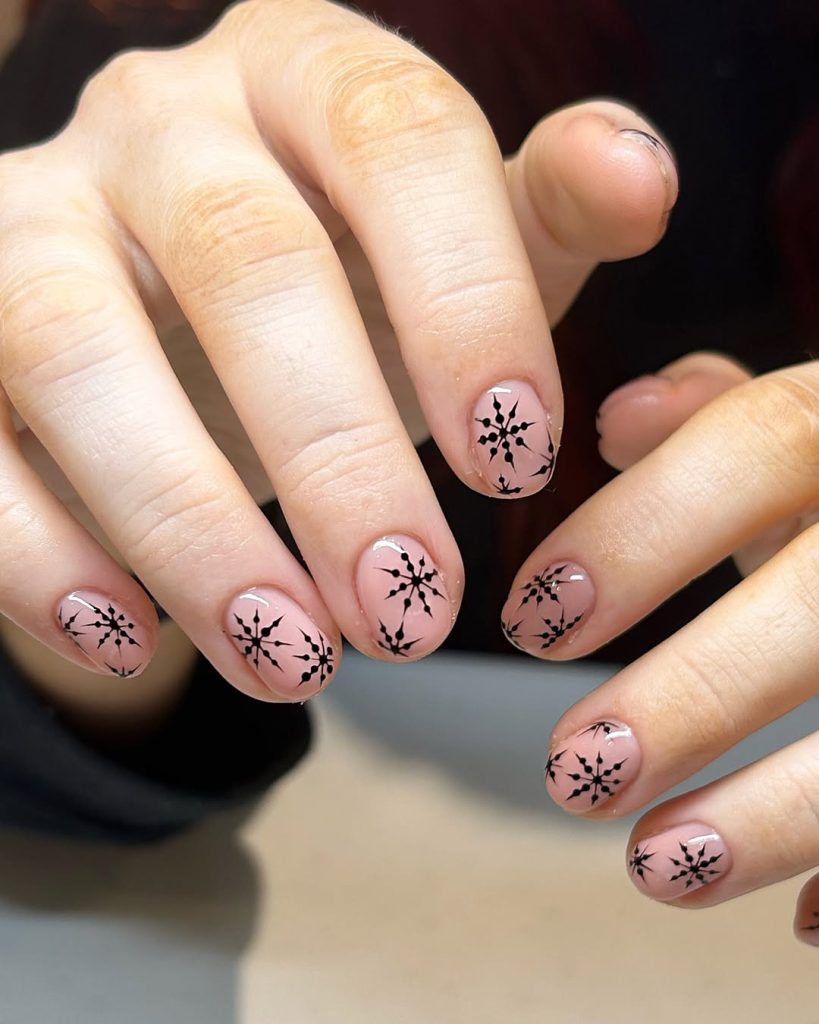 Sometimes the most powerful looks are also the simplest. These soft pink nails topped with delicate black snowflakes are modern, edgy, and unexpectedly chic for the holidays. The contrast makes the snowflakes pop like ink sketches against winter skies, giving the nails a fashion-forward feel without losing their seasonal charm. It’s a fresh take on classic snowflake nails, perfect for anyone craving something different.