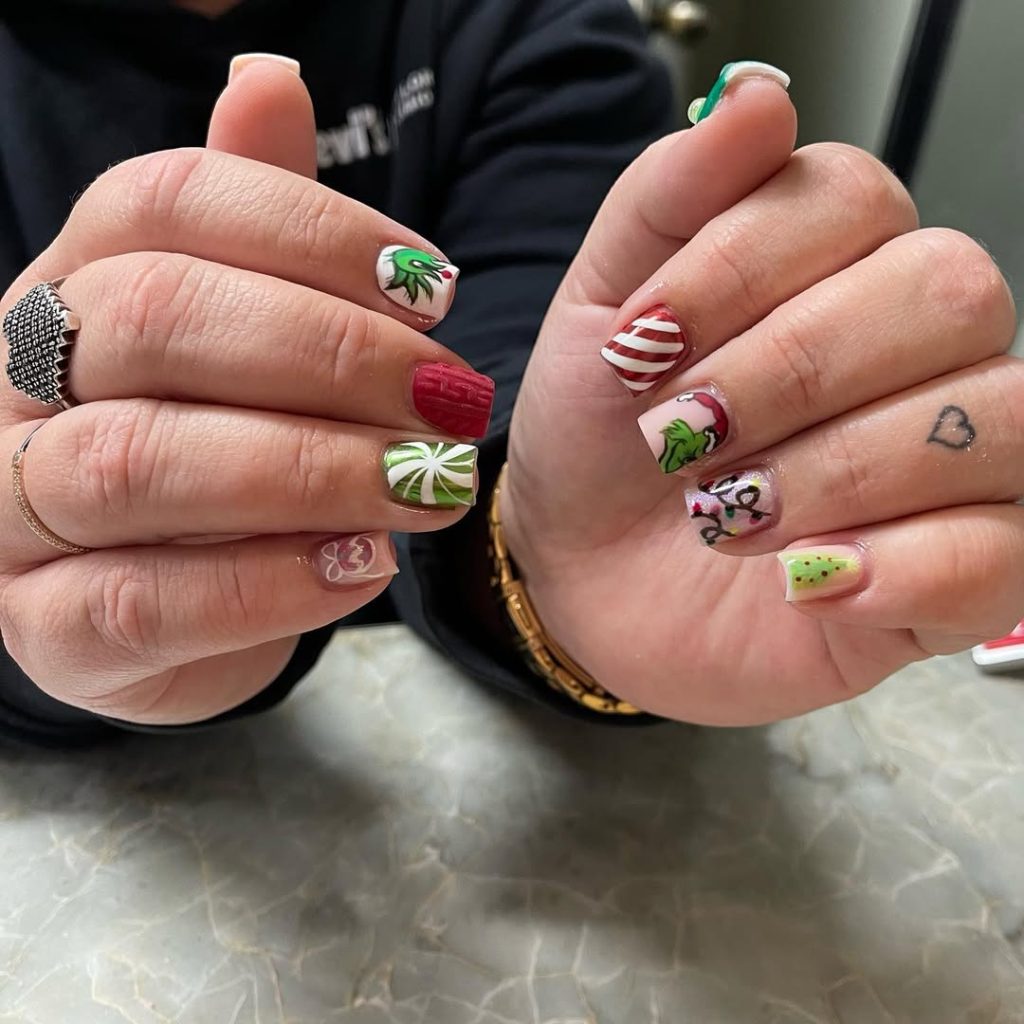 If your holiday mood is more playful and a little mischievous, these nails capture it perfectly. With a mix of candy cane stripes, gift bow designs, Christmas lights, and even the Grinch, this manicure is bursting with festive personality. The variety of red, white, and green designs feels like unwrapping presents under the tree, full of surprise and joy. It’s a super fun take on Christmas nails for anyone who loves bold details.