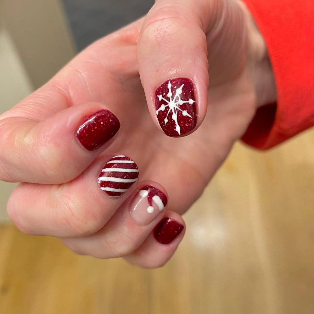 Few things say Christmas as clearly as red glitter, and this manicure brings the sparkle front and center. The shimmering base is paired with playful white designs—snowflakes, stripes, and even a festive hat accent—that keep the look fresh and joyful. It’s a manicure that feels cozy and celebratory at once, making it one of the cutest short Christmas nails designs 2025 has to offer.