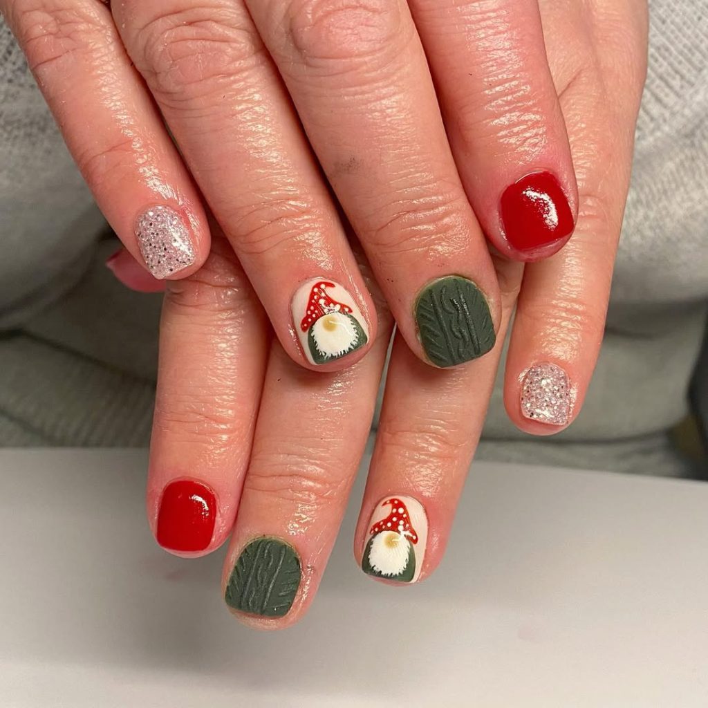 Jully and joyful manicure mixing playful gnome art with green knitted textures of silver sparkling and red polish. It feels like story scene on your nails, combining cute holiday characters and cozy designs inspired by sweaters. The finish mixture—glitter, gloss, and matte—builds a look with so much charm that feels even more festive.
