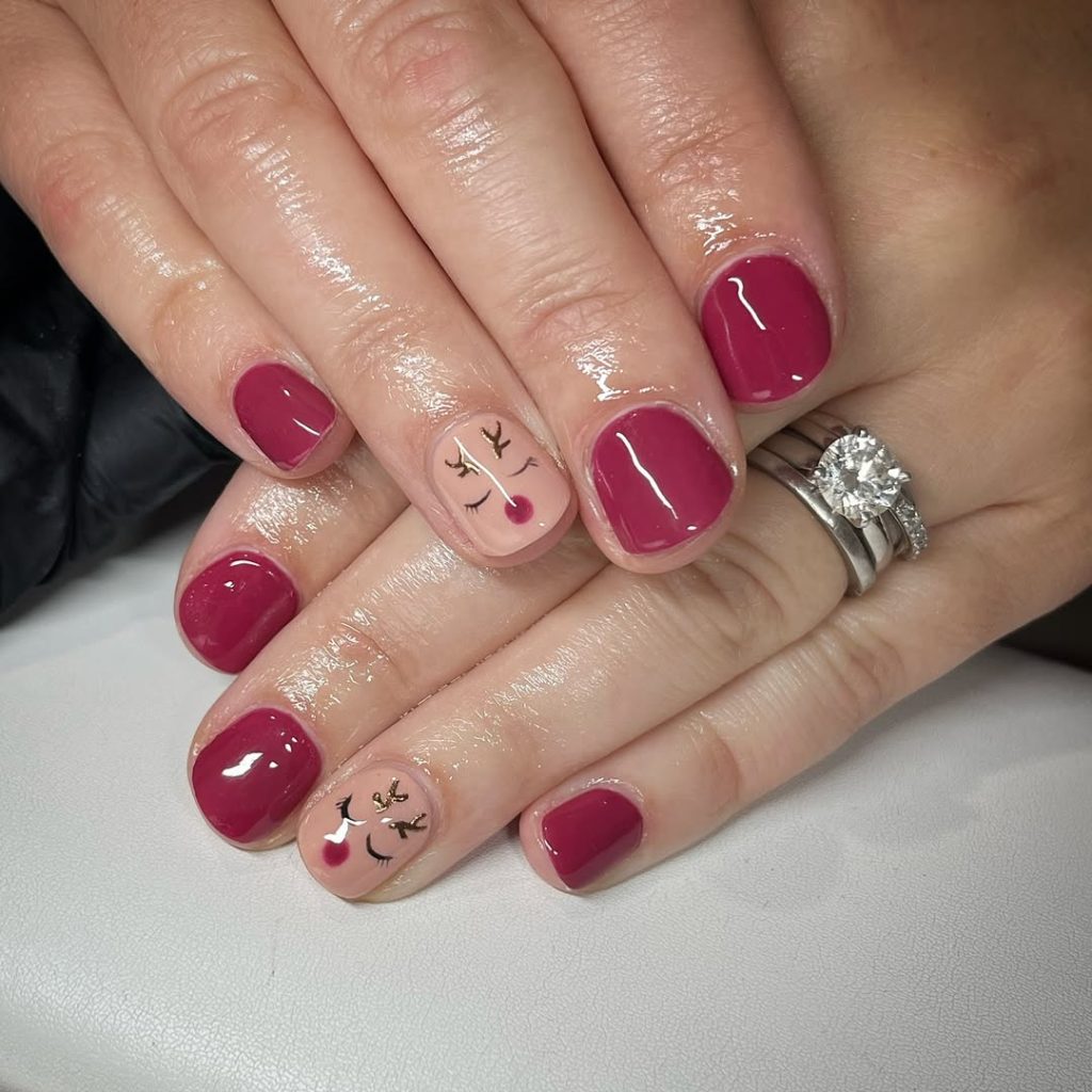 The ironic approach pairs the lustrous deep berry hue with an endearing Rudolph accent nail. Tiny red noses and soft lashes make it fun; the deep glossy color grounds it in sleek sophistication. This design would bring a smile to your face every time you look at your hands! Festive and casual.