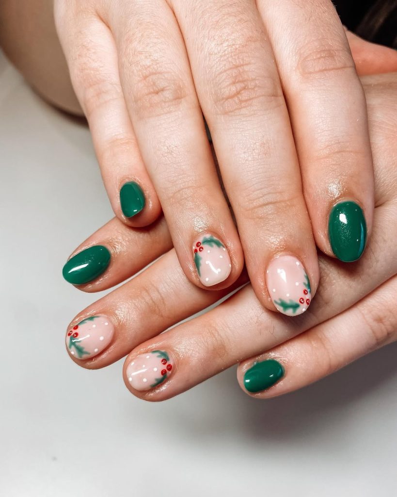 Fresh and festive nails combine glossy-green nails with delicate holly berry designs on a soft nude base. The tiny red dots and leaf details feel timeless. It is like a miniature holiday wreath. It is simplicity itself, yet unmistakably Christmas, a design that turns your nails into holiday decor.