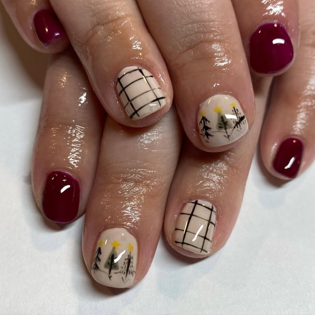 Everywhere, this is a marriage of burgundy nails, grid lines, and tiny pine trees under the glow of yellow stars: it remains hip and modern at once. The art becomes almost striking due to the neutrality of the base, while the grid offers a chic complement. It feels like holiday nails for somebody who enjoys subtle seasonal cues rather than hitting you with the cliché.