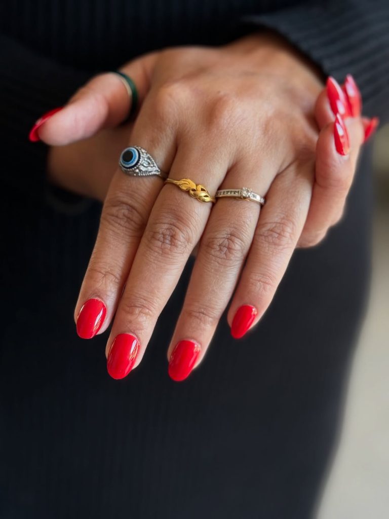 If you want a manicure that suits almost every lifestyle, this is it. Short oval nails work well for women with busy schedules, since they’re low-maintenance yet still elegant. The shape flatters most hand types, and the strong red tone enhances natural warmth in the skin, making it a great choice for summer colors or even classy acrylic moments. It’s a simple way to add something extra to your everyday style.