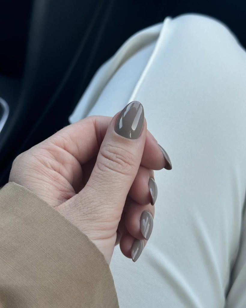 This taupe manicure is the definition of understated chic—smooth, glossy, and effortlessly modern. The color sits beautifully between cool and warm tones, giving it a sophisticated neutrality that works with absolutely everything. It’s one of those shades that makes your hands look instantly polished without drawing too much attention.