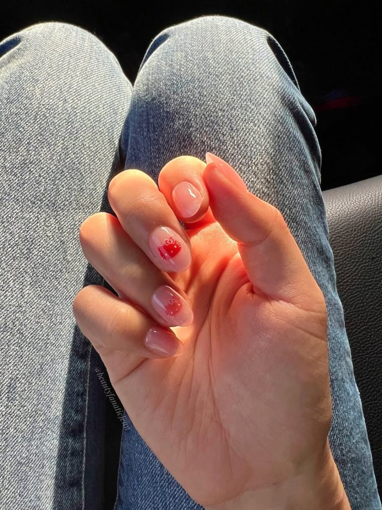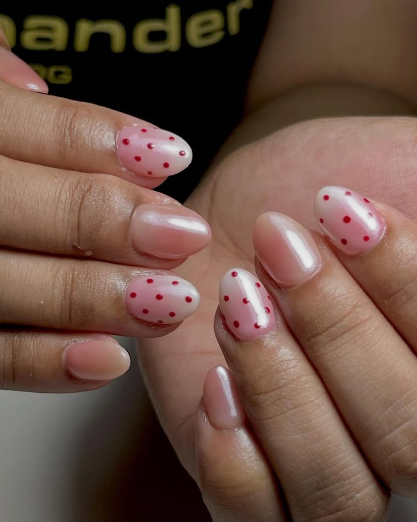 This adorable dot design brings a sweet, retro charm to short oval nails. The sheer pink base feels clean and natural, while the tiny red dots add a fun pop of color that instantly brightens the hands. It’s playful without being too much, making it perfect for anyone who loves cute, simple accents that still feel polished and grown-up.