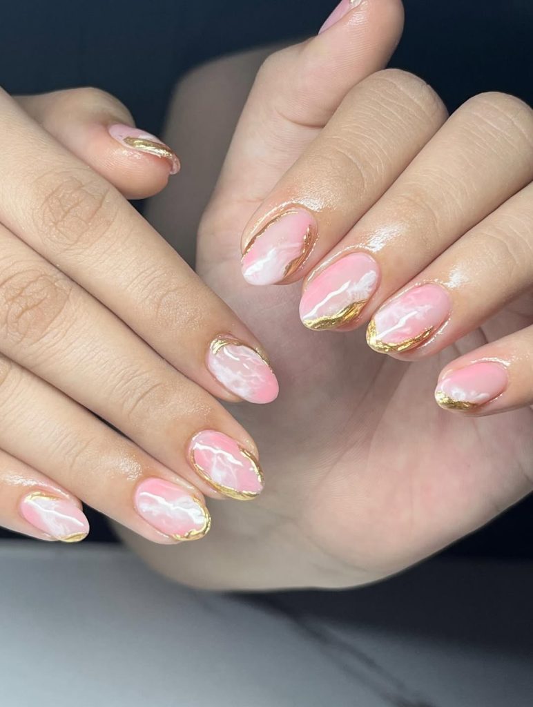 This dreamy pink marble design looks like swirling clouds at sunset—soft, delicate, and beautifully feminine. The creamy movement of the white streaks gives the nails a luxurious, almost ethereal quality. Gold accents outlining each nail add a refined, elegant finish, creating a look that feels both artistic and chic. It’s a gorgeous choice for anyone who loves pretty details without going too bold.