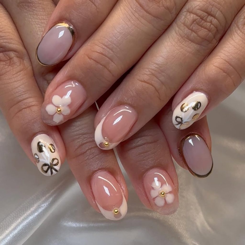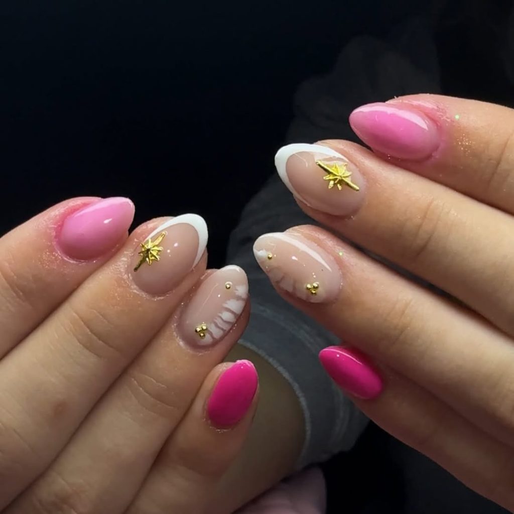 This playful mix of pink, white, and gold brings a lively, youthful energy to short oval nails—the kind of design that instantly lifts your mood. With bright pink accents, soft French moments, and tiny gold embellishments, there’s a fun balance of creativity and elegance. It feels a little extra in the best way, offering both bold color and delicate detail without overwhelming the shape of the nail.