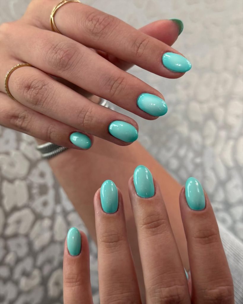This vibrant turquoise manicure feels like a breath of cool, fresh air—bright, glossy, and full of energy. The color is striking but still soft enough to wear every day, giving the nails a polished, modern look. It’s the kind of shade that instantly lifts your mood and adds a playful touch to even the simplest outfit.