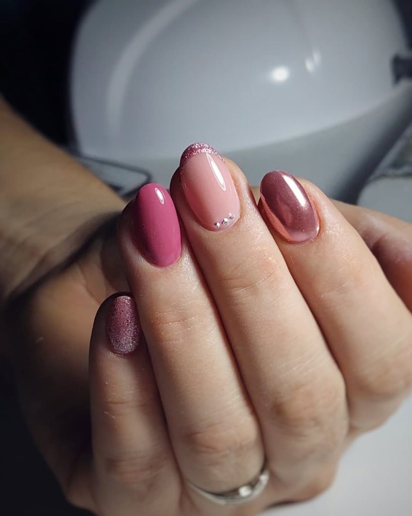 This romantic pink manicure blends different tones and textures to create a soft, elegant look with just the right amount of sparkle. From glossy pink to shimmering rose and a delicate accent with tiny crystals, the mix feels thoughtful and beautifully coordinated. It’s charming, feminine, and perfect for women who enjoy a little variety without going too bold.