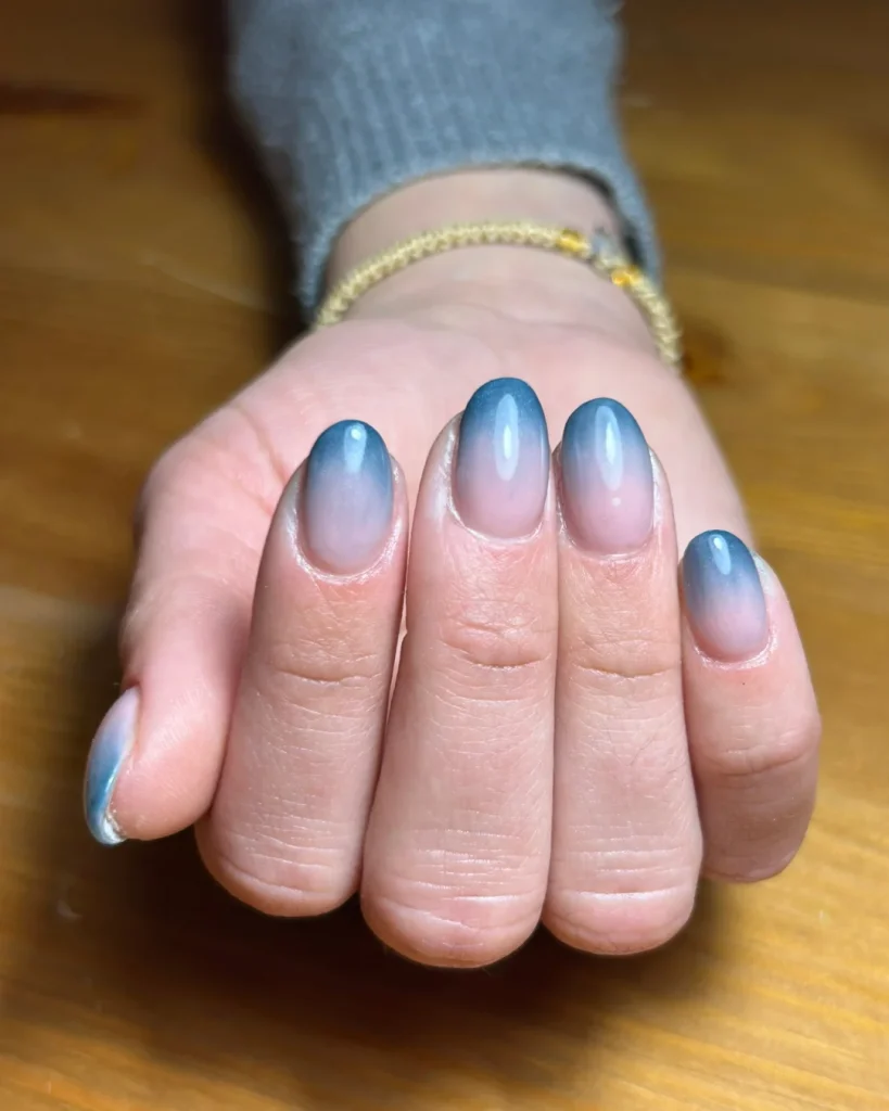 3. Blue-Grey Gradient Softness on Short Oval Nails