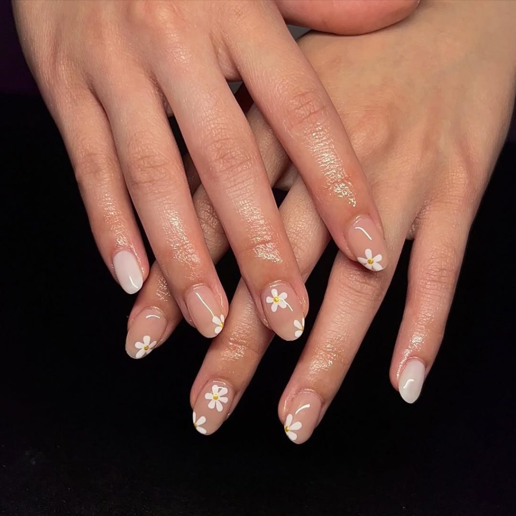 This delicate neutral manicure blends soft beige tones with tiny floral details and gold accents, creating a look that’s both elegant and full of personality. The glossy finish enhances the softness of the base color, while the white flowers and subtle gold touches add a sweet, decorative charm. It’s feminine, graceful, and perfect for someone who wants something a little special without leaning too bold.