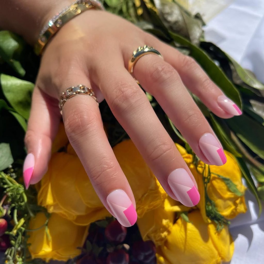 This manicure brings such a fresh, modern feel with its playful mix of soft pink and bold geometric tips. The contrast between the sheer base and the vibrant shapes gives the nails a chic, contemporary twist without losing that feminine softness. It feels artistic but still very wearable—the kind of look that instantly brightens your day and adds a little personality to your outfit.