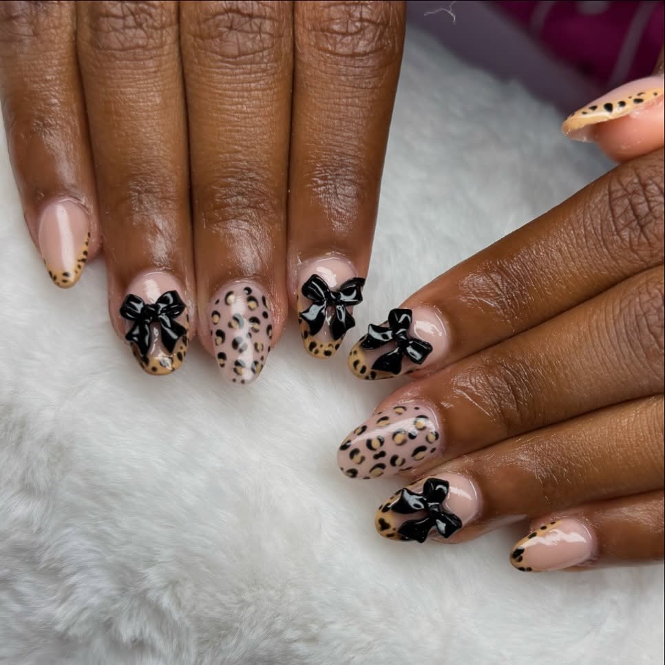 The way the design is presented is full of attitude, with fun leopard spots, shiny neutrals, and big bold black bows that provide a fashion-forward, playful, and stylish twist to the nails’ design. The design appears bold, glamorous, and bold without apology, with the contrasting colors that appear elegant, providing each nail with the appearance of having its own accessory, ideal for those who enjoy having their nails create a fashion statement.
