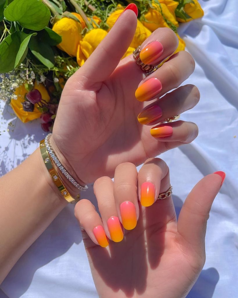 “If you love summer colors and design ideas that are just happy, then you are going to love this design.” The short oval nails provide some much-needed contrast with the deep colors, allowing you to have a colorful yet subtle mani with the nails looking beautiful yet gentle on the eyes. It is also great inspiration if you are going on trips or just hanging out with the girls over the weekend or any time you are looking for something extra but with simplicity that will surely spark envy! The gradient effect wears well too, making it another design that is practically maintenance-free!