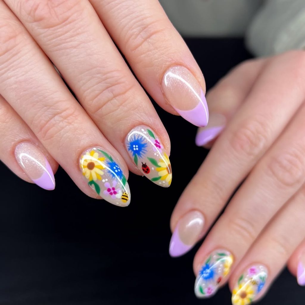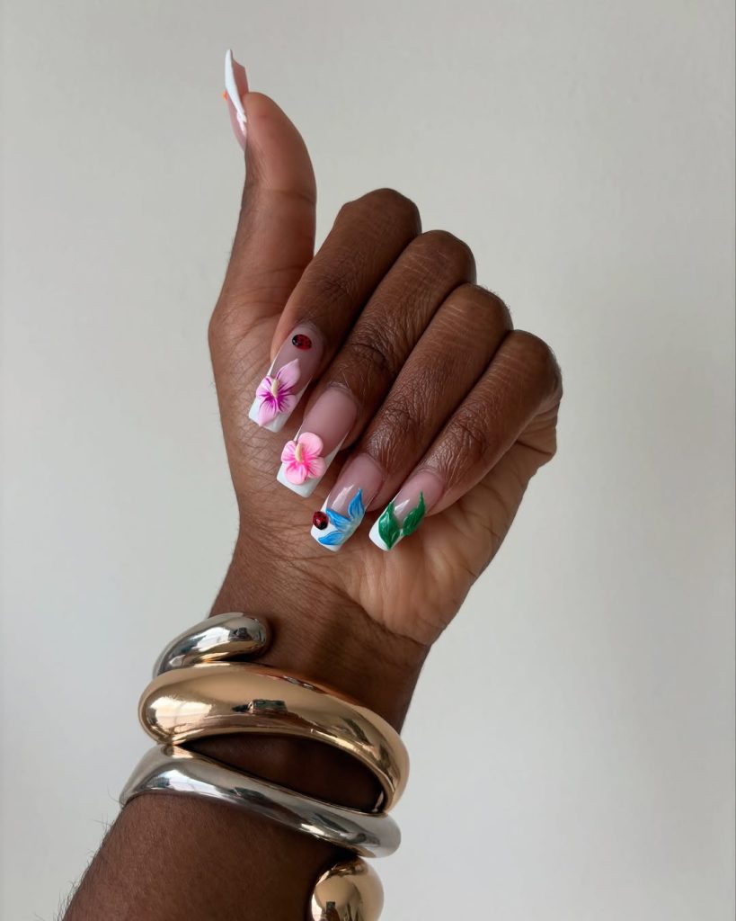 These nails feel like the very first warm day of spring—when everything starts blooming again and you can finally put away your winter layers. The soft floral accents and tiny ladybug detail bring a playful, nature-inspired charm that feels lighthearted and perfectly suited for a birthday celebration.