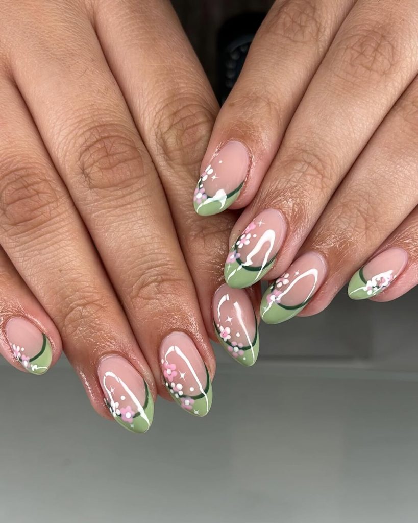There’s a calm sophistication to these nails that feels effortlessly chic. The muted sage tones combined with delicate floral accents create a look that’s fresh, graceful, and quietly celebratory. It’s the manicure equivalent of a relaxed brunch with close friends—intimate, stylish, and full of warmth.
