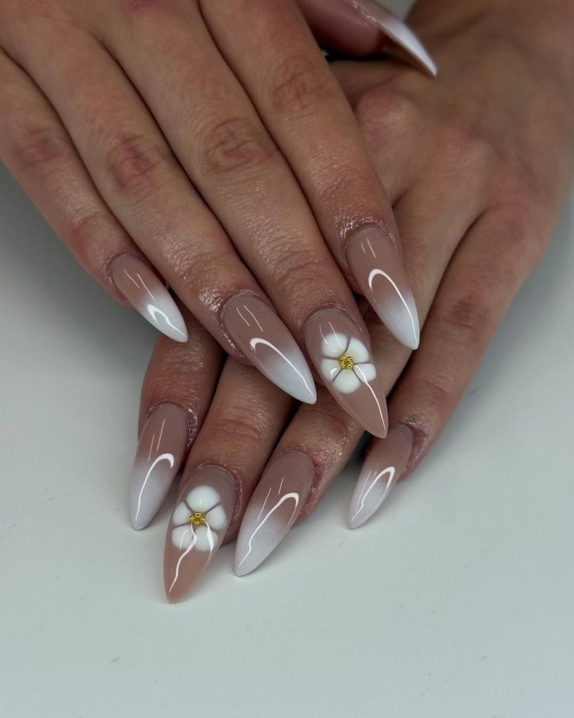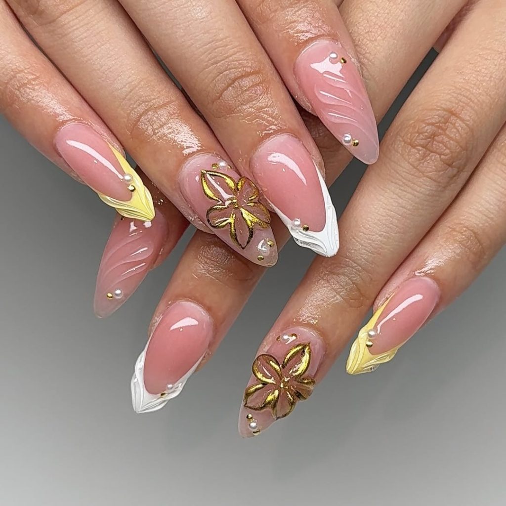 These nails bring a soft glow that feels quietly luxurious. The combination of neutral tones, sculpted petals, and golden accents creates a manicure that feels celebratory in a refined way—like dressing up just enough to mark the moment while still feeling like yourself.