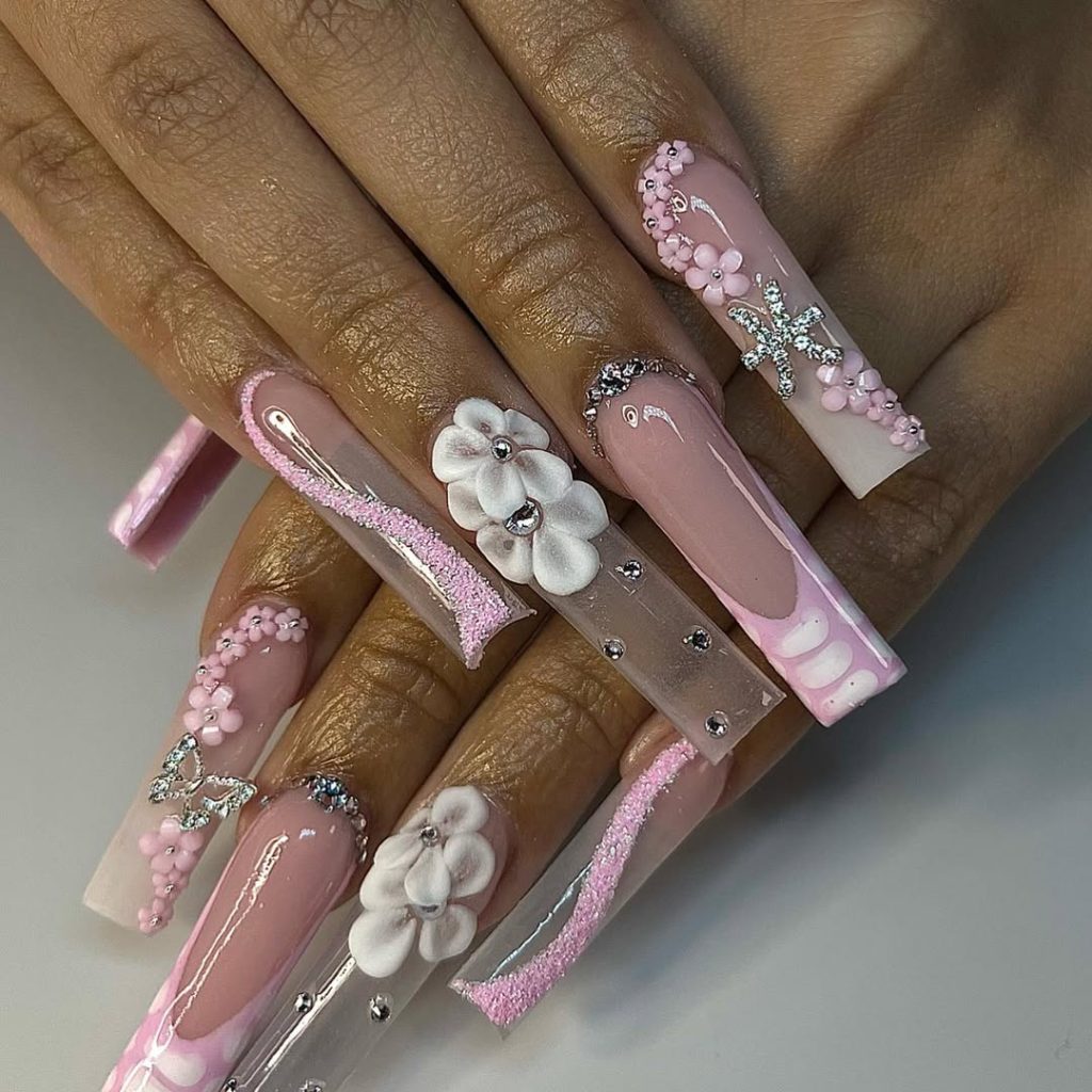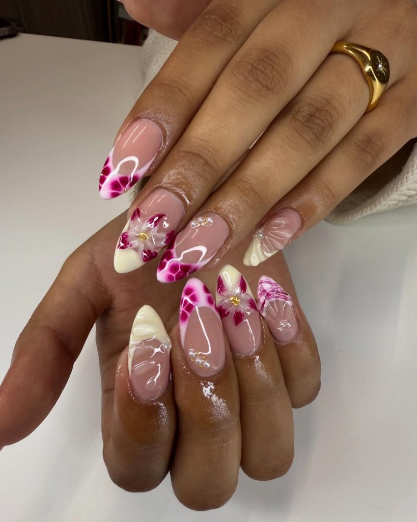 These nails feel soft, feminine, and quietly celebratory—like receiving flowers first thing on your birthday morning. The flowing pink details and sculpted petals create a delicate, almost watercolor effect that feels graceful and timeless, making the whole look effortlessly elegant.