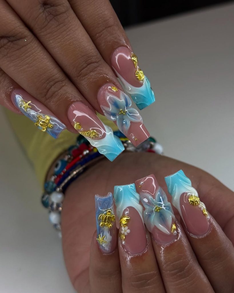 These nails instantly bring to mind a spring getaway—soft blues, flowing shapes, and golden accents that feel like sunlight reflecting on water. They’re playful yet elegant, perfect for someone celebrating with a sense of adventure or simply wanting something refreshingly different.
