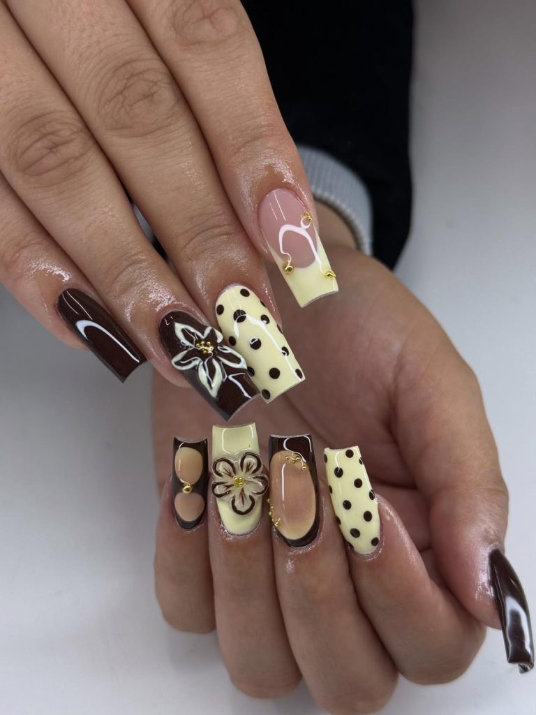 Rich brown tones paired with soft cream details make this manicure feel cozy, stylish, and slightly unexpected for spring. It has a fashion-forward vibe—like mixing textures in an outfit—creating a look that feels confident, creative, and uniquely personal.