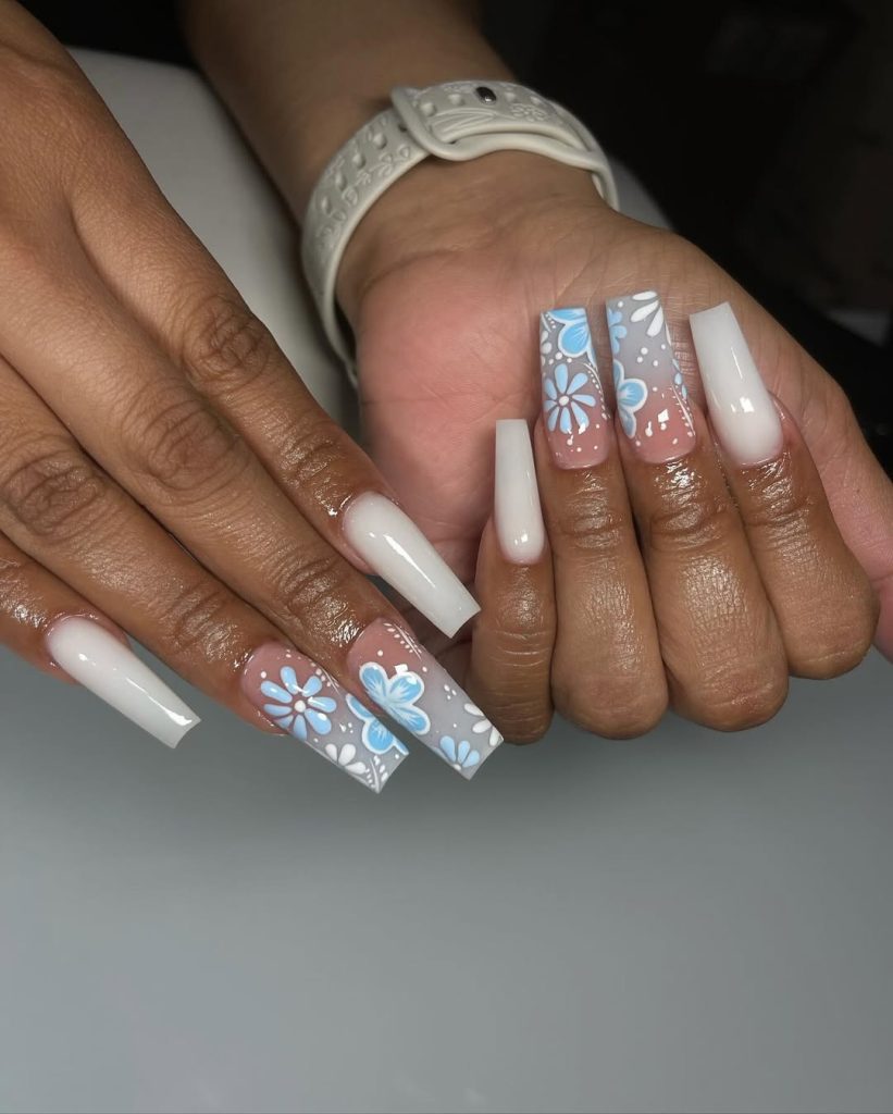 There’s something incredibly fresh about this color palette. The mix of soft Blue florals and creamy neutrals feels airy and relaxed, like a spring afternoon spent outdoors with friends. It’s the kind of manicure that doesn’t demand attention but quietly earns compliments throughout the day.