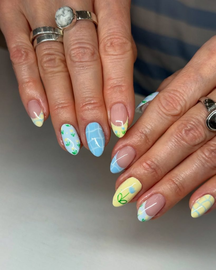 11. Soft Blue and Yellow Spring Break Nails with Hand-Drawn Details