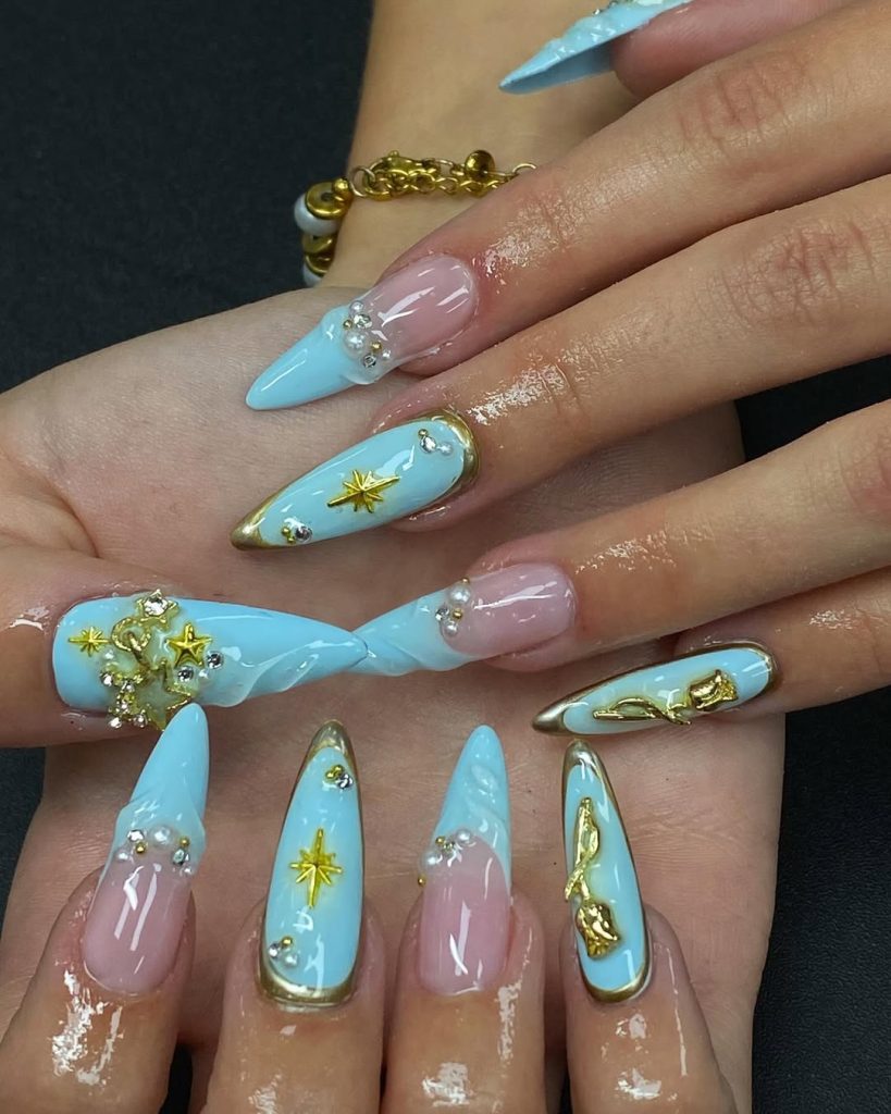 12. Luxe Blue Spring Break Nails with Gold Accents