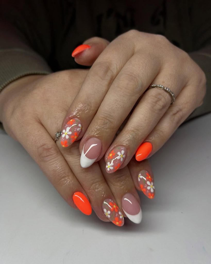 14. Bright Orange Floral Spring Break Nails with French Details